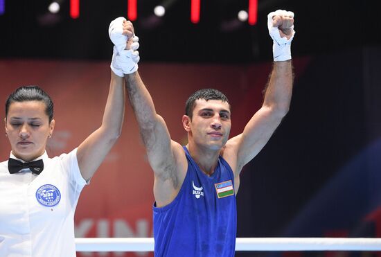 Uzbekistan's Shakhobidin Zoirov, in blue, celebrates his victory over France's Billal Bennama, in red, after the men's fly weight (48-52 kg) semifinals bout at the 20th World Boxing Championship, in Yekaterinburg, Russia.20.09.2019#6016246