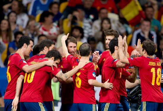 Spanish players jubilate after scoring a goal against Italy in the EURO 2012 final match.01.07.2012#1170305