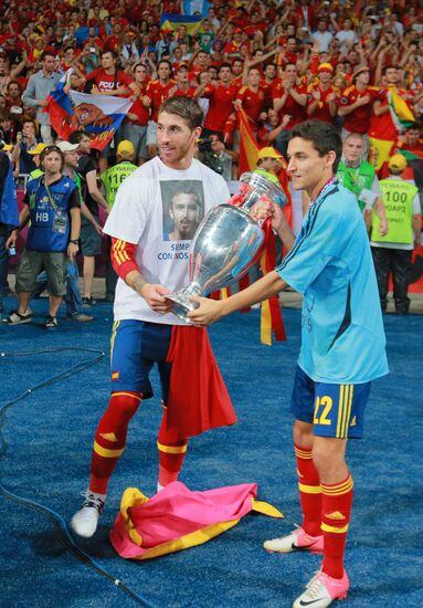 Spanish national team players Sergio Ramos and Jesus Navas (left) with the cup at the awards ceremony for the European Football Championship 2012.01.07.2012#1170370