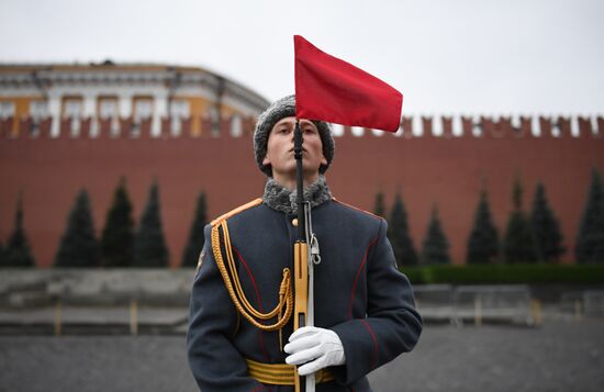 A Russian honour guard soldier stands at attention during a rehearsal of the historical parade to commemorate the 78th anniversary of the military parade at the Red Square, in Moscow, Russia. Soldiers were sent straight from the parade on November 7, 1941, to the front to fight the invading Nazis.05.11.2019#6064431