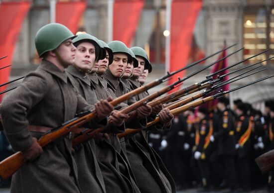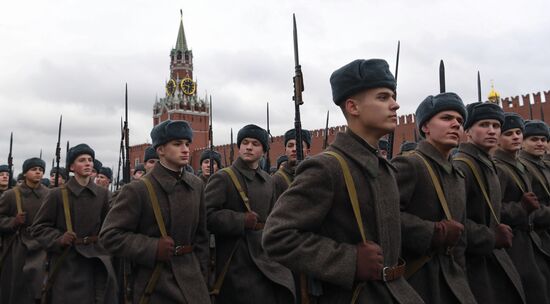 Russian soldiers dressed in historical costumes take part in a rehearsal of the historical parade to commemorate the 78th anniversary of the military parade at the Red Square, in Moscow, Russia. Soldiers were sent straight from the parade on November 7, 1941, to the front to fight the invading Nazis.05.11.2019#6064452