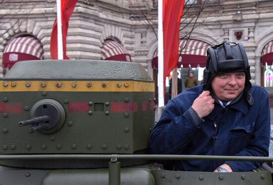 Russian tankman dressed in the Soviet military uniform takes part in a rehearsal of the historical parade and military equipment exhibition to commemorate the 78th anniversary of the military parade at the Red Square, in Moscow, Russia. Soldiers were sent straight from the parade on November 7, 1941, to the front to fight the invading Nazis.05.11.2019#6064531