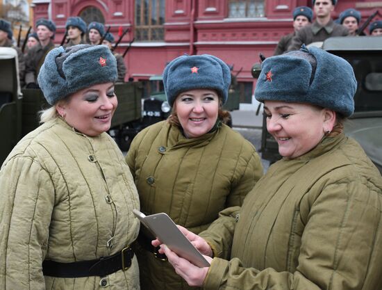 Participants dressed in Soviet-era military uniforms use a smartphone as they attend a parade to mark the 78th anniversary of a historical parade in 1941, when Soviet soldiers marched towards the front lines during World War Two, on Red Square in central Moscow, Russia.07.11.2019#6066463