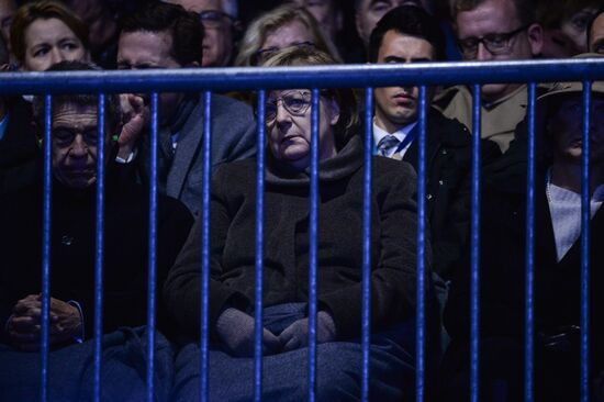 German Chancellor Angela Merkel attends a show in front of the Brandenburg Gate to mark the 30th anniversary of the fall of the Berlin Wall in Berlin, Germany. Special events take place in Berlin to mark the 30th anniversary of the fall of the Berlin Wall, marking the reunification of the people of Germany and the GDR.09.11.2019#6068646