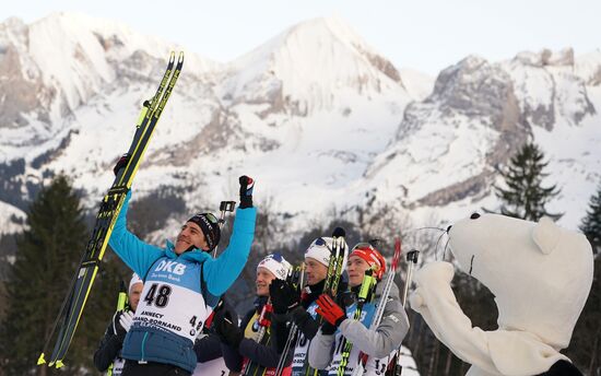 Gold medalist Germany's Benedikt Doll waves after the men 10 km sprint competition at the Biathlon World Cup, in the village of Le Grand Bornand outside Annecy, France.19.12.2019#6111217