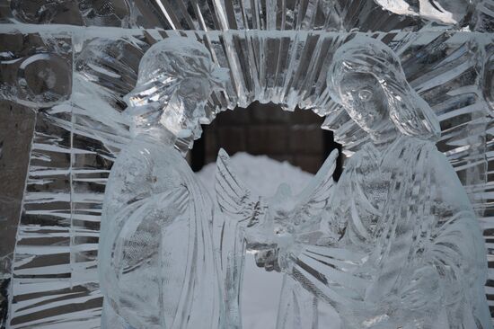 The ice sculpture is pictured next to the Church of All Saints on Orthodox Christmas Eve in Yekaterinburg, Russia.06.01.2020#6125146