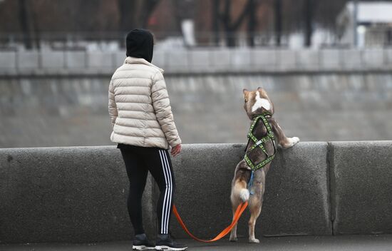 A man walks on a warm winter day, in Moscow, Russia. Russia's Defence Ministry headquarters, is in the background.18.02.2020#6170797