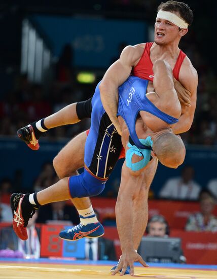 Russian wrestler Alan Khugaev (in red) and Egyptian wrestler Karam Mohamed Gaber Ebrahim during the final bout in Greco-Roman wrestling competitions in weight category to 84 kg at the Olympic Games 2012 in London.06.08.2012#1205331