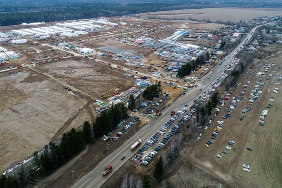 An aerial view shows a construction site of a new infectious hospital as a part of measures against the spread of coronavirus, not far from the village of Golokhvastovo, Moscow, Russia.03.04.2020#6212503