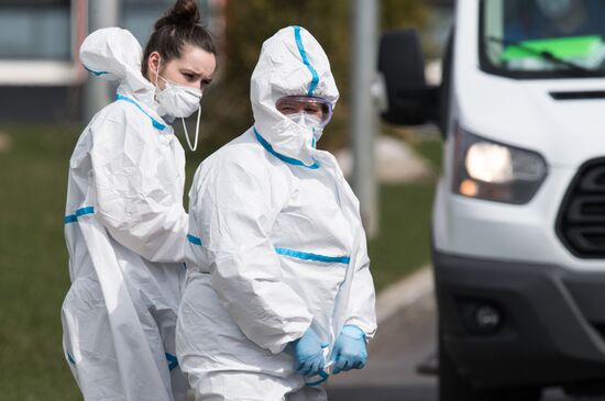 Ambulance crew members wearing protective suits accompanied suspected COVID-19 patients arriving at the Novomoskovsky multipurpose medical center for patients with suspected COVID-19 coronavirus infection, outside Moscow, Russia.30.04.2020#6231868