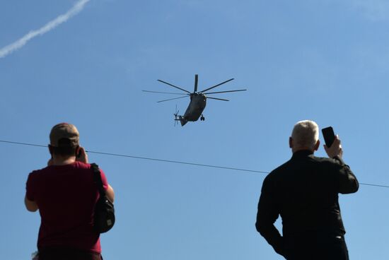 A Mil Mi-26 transport helicopter is pictured during the rehearsal of the aerial part of the parade dedicated to the celebration of the 75th anniversary of Victory in the Great Patriotic war in Yekaterinburg, Russia.07.05.2020#6235317