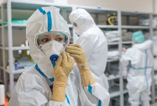 Medical workers in a protective suit and masks are pictured in an intensive care department of the Federal Clinical Center of Higher Medical Technologies of the Federal Medical-Biological Agency in Khimki, outside Moscow, Russia. The medical facility treats COVID-19 patients, patients with suspected coronavirus, and patients with viral community-acquired pneumonia.07.04.2020#6236400
