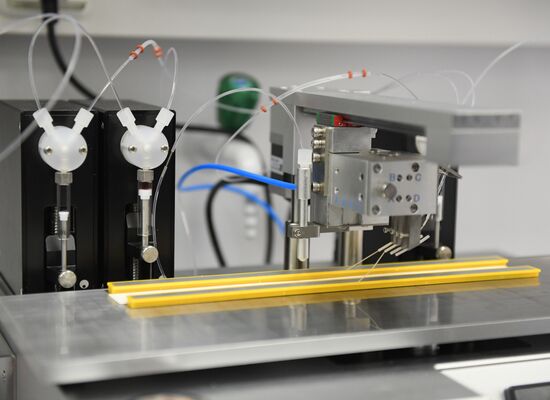 A marker for detecting coronavirus antibodies is being placed on a piece of paper during a production of test systems for antibodies to COVID-19 at the Institute of Fundamental Medicine and Biology of Kazan Federal University, in Kazan, Russia. 23.06.2020#6270407