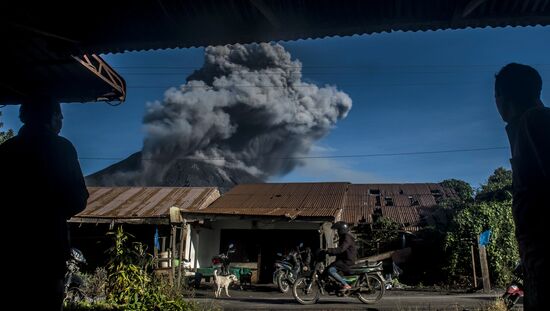 Sinabung volcano erupts at Gamber village in Karo, North Sumatra, Indonesia. On total of 28 people died after being hit by giant hot clouds from the last eruption of the Sinabung volcano in 2010, 2014, and 2016 including eruption on the 10th of August, 2020. Experts researched as many as 800 million people live and do their activities within 100 kilometers, or about 62 miles, of volcanic craters around the world.14.08.2020#6340498