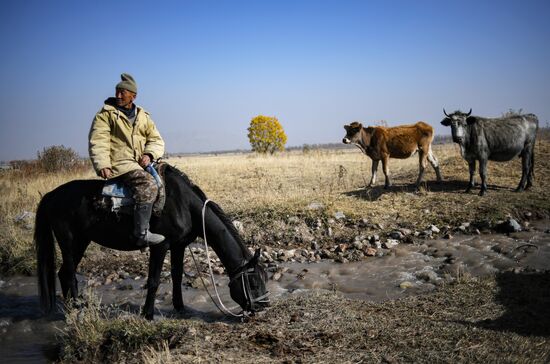 A shepherd rides a horse whilst herding his cattle as a hot air balloon floats in the background, outside Bishkek, Kyrgyzstan.17.10.2020#6360211