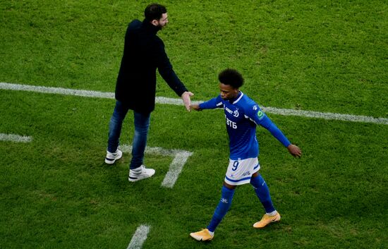 Dynamo's head coach Sandro Schwarz, left, speaks with Dynamo's Clinton N'Jie during the Russian Premier-League soccer match between Sochi and Dynamo Moscow, in Sochi, Russia.16.12.2020#6420742