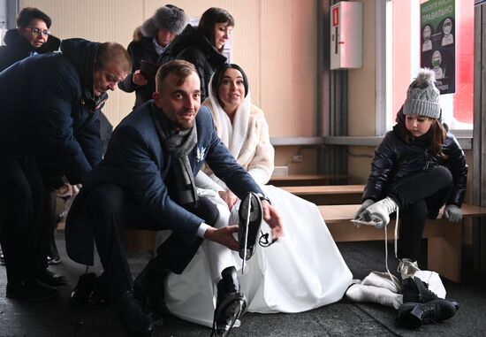 A bride and a groom put on ice-skates as they get married on an ice skating rink in Moscow, Russia. 14.02.2021#6462244