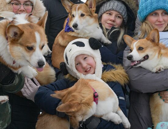 People with their dogs take part in the corgi costume parade to mark St. Valentine's Day, in St. Peretsburg, Russia.14.02.2021#6462289