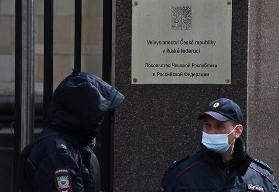 Law enforcement officers stand guard at the entrance of the Czech Republic Embassy in Moscow, Russia. Moscow announced its decision to expel 20 Czech diplomats in response to the expulsion of Russian diplomats from Prague and gave the Czech diplomatic staff time until the end of Monday to leave Russia. 19.04.2021#6521728