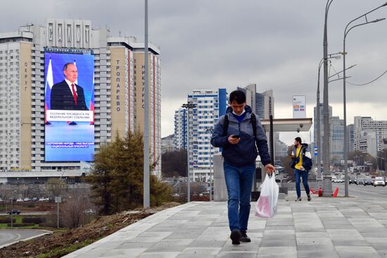 A man walks in a street as a screen on the facade of a hotel shows an image of Russian President Vladimir Putin and a quote from his annual address to the Federal Assembly in Moscow, Russia.21.04.2021#6523272