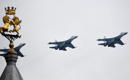 Sukhoi Su-34, Su-35S, and Su-30SM fighter jets fly over Moscow during the Victory Day military parade due to mark the 76th anniversary of the victory over Nazi Germany in World War II, in Moscow, Russia.09.05.2021#6539749