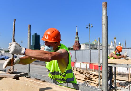 Workers repair the Bolshoi Kamenny Bridge (Greater Stone Bridge) over the Moskva River, with the Kremlin seen in the background, in central Moscow, Russia.07.07.2021#6591544