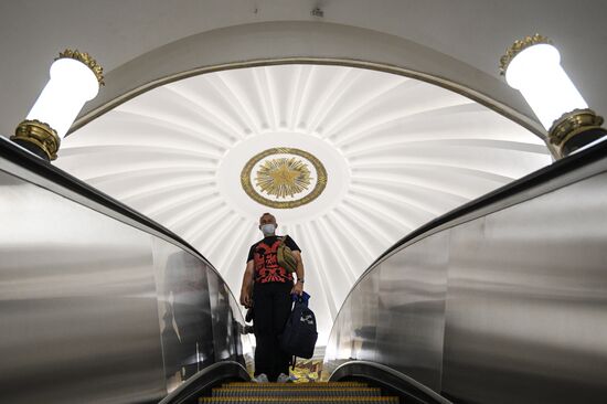 A passenger is pictured on an escalator at the Smolenskaya station of the Moscow Metro opened after restoration, in Moscow, Russia.09.07.2021#6592692