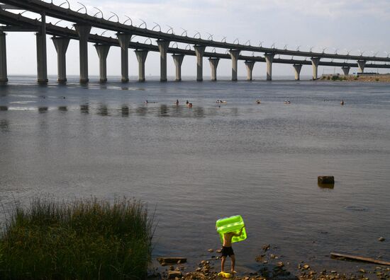 People cool off in water on a hot summer day with the Western High-Speed Diameter (ZSD) toll motorway seen in the background, on Kanonersky Island, in St. Petersburg, Russia.10.07.2021#6593910
