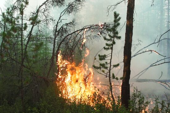 In this handout video grab released by the Aerial Forest Protection Service, forest burns during a wildfire in the Republic of Sakha (Yakutia), Russia. The Russian Emergencies Ministry sent a combined engineer regiment and specialized equipment for battling wildfires raging in Yakutia. A state of emergency was declared in the region, entering the forests is banned since July 1. Editorial use only, no archive, no commercial use. 03.08.2021#6616751