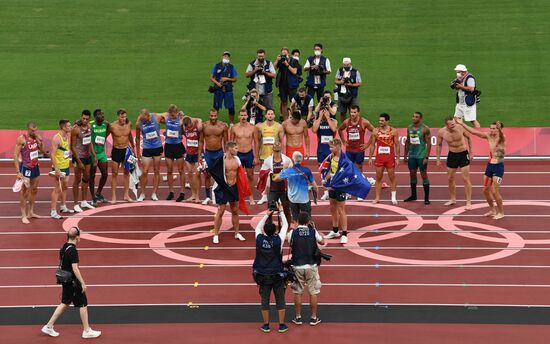 Athletes pose for a family photo after finishing in the men's decathlon 1500m during the athletics event at the Tokyo 2020 Olympic Games at Olympic Stadium in Tokyo, Japan.05.08.2021#6619062