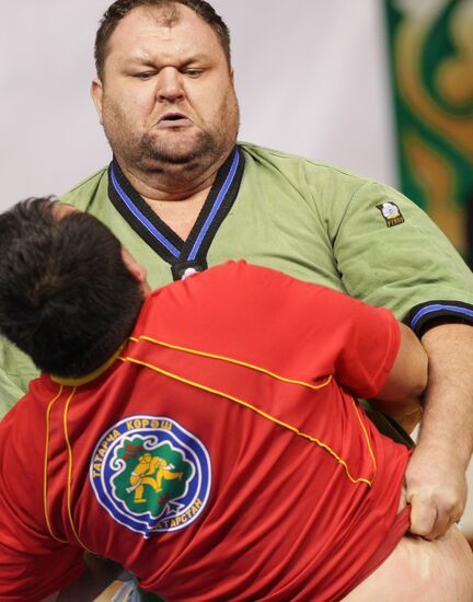 Ryasim Yangayev, right, and Nurlan Cherniyazov fight a bout in the 70 kg weight class during the Russian Kurash Wrestling Tournament and Championships in the Ak Bars Palace of Martial Arts.08.12.2012#1309688