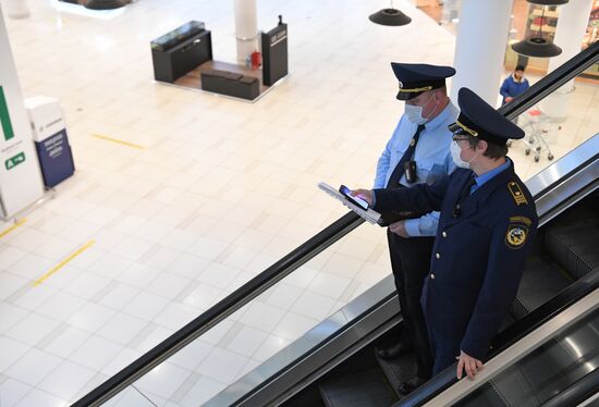 An employee of the Moscow City Association of Administrative and Technical Inspection Offices takes part in a raid to check the mask regime at the Aviapark shopping center, in Moscow, Russia. Russia on Wednesday reported 22,430 new coronavirus cases and 857 deaths - the highest number of daily fatalities since the start of the pandemic.29.09.2021#6661813