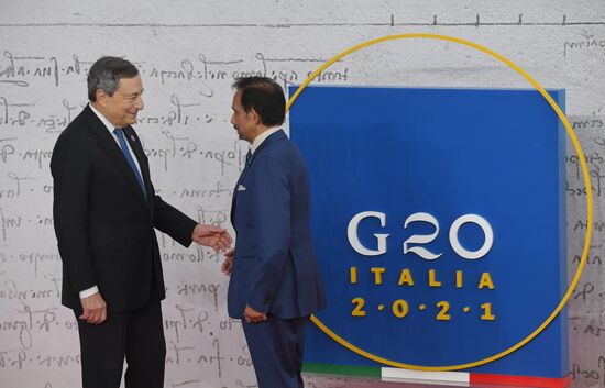 Italian Prime Minister Mario Draghi welcomes Brunei's Sultan Hassanal Bolkiah as he arrives for the G20 Leaders' Summit at La Nuvola Congress Centre in Rome, Italy.30.10.2021#6685258
