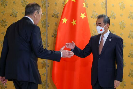 In this handout photo released by the Russian Foreign Ministry, Chinese Foreign Affairs Minister Wang Yi and Russian Foreign Minister Sergey Lavrov meet on the sidelines of the 2021 G20 Rome summit, in Rome, Italy. Editorial use only, no archive, no commercial use.30.10.2021#6685803