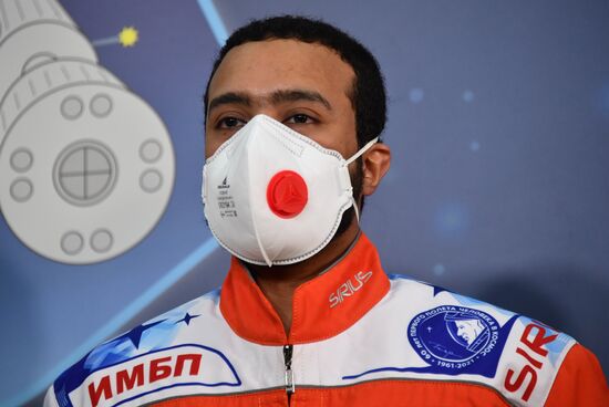 Oleg Blinov, an instructor of the Cosmonaut Training Center, wearing a protective face mask speaks ahead of the SIRIUS-2021 international isolation experiment simulating a mission to the Moon, in Moscow, Russia. The six volunteers will spend 240 days in a simulator of a spacecraft - a ground-based test complex in Moscow. The task of the "crew" is to simulate the flight, landing on the Moon and work on its surface.04.11.2021#6688667