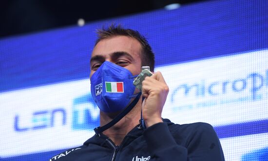 Gold medalist Italy's Gregorio Paltrinieri poses during the awarding ceremony for the men's 800m freestyle final at the European Short Course Swimming Championships, in Kazan, Russia's Republic of Tatarstan.07.11.2021#6690993