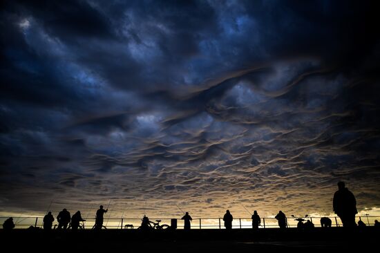 People are silhouetted against the setting sun as they cross the street via an overhead pedestrian crossing, in Moscow, Russia.10.12.2021#6718836