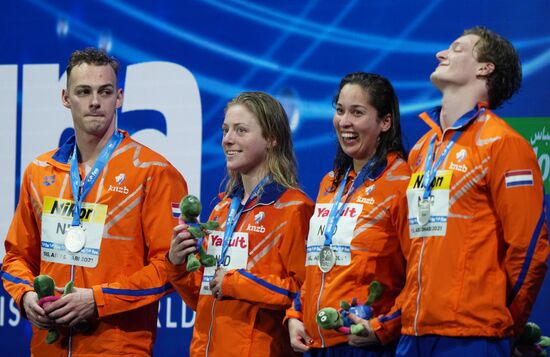Silver medalists Netherlands' Jesse Puts, Thom de Boer, Ranomi Kromowidjojo and Kira Toussaint pose during the award ceremony for the mixed 4x50m freestyle relay final at the World Swimming Championships (25m), in Abu Dhabi, United Arab Emirates.17.12.2021#6724209