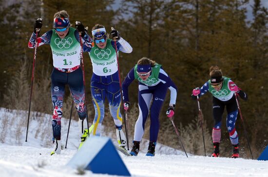 From left, Norway's Therese Johaug, Sweden's Ebba Andersson, Finland's Johanna Matintalo and Rosie Brennan, of the United States, compete in the women's cross-country 4x5 km relay event during the Beijing 2022 Winter Olympic Games at the National Cross-Country Skiing Centre in Zhangjiakou, China.12.02.2022#8112285