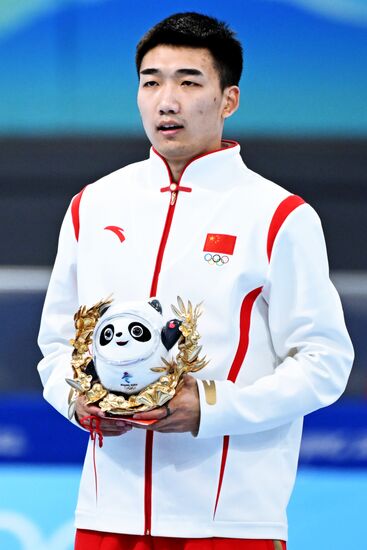 Gold medalist China's Gao Tingyu celebrates on the podium during a flower ceremony for the speed skating men's 500 m event during the Beijing 2022 Winter Olympic Games at the National Speed Skating Oval in Beijing, China.12.02.2022#8112246