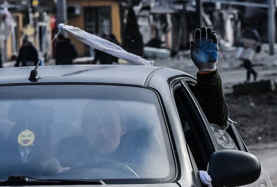 Armored vehicles of DPR Peoples Militia are seen on the outskirts of the city of Mariupol, Donetsk People's Republic. The city has been a site of intense fighting in recent weeks.18.03.2022#8144448