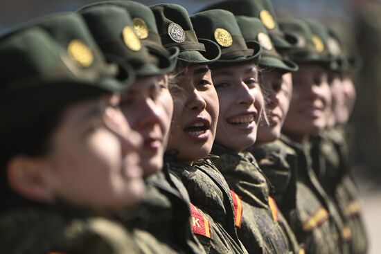Servicewomen take part in a rehearsal for the Victory Day parade, which marks the 77th anniversary of the victory over Nazi Germany in World War Two, at the Alabino training ground, Moscow region, Russia.18.04.2022#8168605