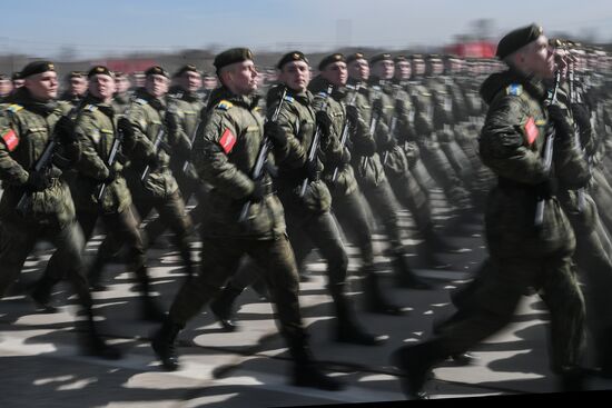 Servicemen take part in a rehearsal for the Victory Day parade, which marks the 77th anniversary of the victory over Nazi Germany in World War Two, at the Alabino training ground, Moscow region, Russia.18.04.2022#8168501