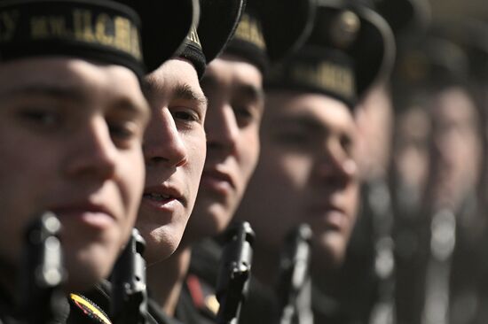 Cadets of the Naval Polytechnic Institute take part in a rehearsal for the Victory Day parade, which marks the 77th anniversary of the victory over Nazi Germany in World War Two, at the Alabino training ground, Moscow region, Russia.18.04.2022#8168596
