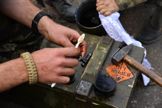 Servicemen of militia of Luhansk People's Republic prepare mortar shells to be fired towards positions of Ukrainian armed forces in the course of Russia's military operation in Ukraine, in the settlement of Nizhne, Luhansk People's Republic.24.05.2022#8199999