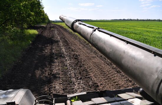Service members of militia of Luhansk People's Republic fire from a T-80 tank towards positions of Ukrainian armed forces in the course of Russia's military operation in Ukraine, in the settlement of Toshkivka, Luhansk People's Republic.23.05.2022#8200037