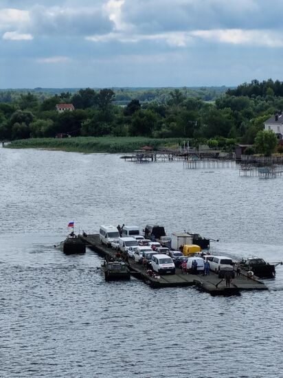 Residents cross Dnipro River by a pontoon crossing as Russia's military operation in Ukraine continues, in Kherson region, partially controlled by pro-Russian troops, Ukraine. A pontoon ferry has been built by Russian military engineers to allow residents to cross the Dnipro River near Kherson after a strategic Antonivskiy Bridge was seriously damaged by the shelling by the Ukrainian Armed Forces.03.08.2022#8247698