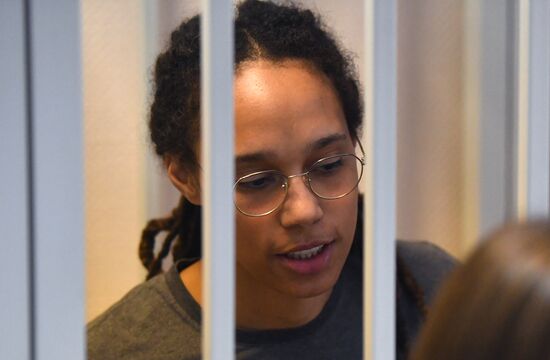 US basketball star Brittney Griner is seen inside a defendants' cage as she attends a court hearing on her case in Khimki, outside Moscow, Russia. Brittney Griner, a two-time Olympic gold medalist in basketball, was detained at a Moscow airport in February after a police dog alerted officers to a vape cartridge containing cannabis extracts in her luggage.04.08.2022#8248237