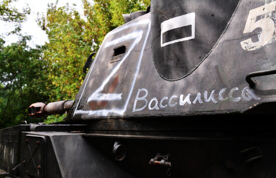 A serviceman thumbs up as he sits inside a a 2S3 Akatsiya self-propelled howitzer in the course of Russia's military operation in Ukraine, in Kharkiv region, Ukraine.14.08.2022#8252750