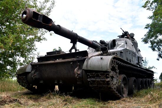 A view shows a 2S3 Akatsiya self-propelled howitzer in the course of Russia's military operation in Ukraine, in Kharkiv region, Ukraine.14.08.2022#8252745